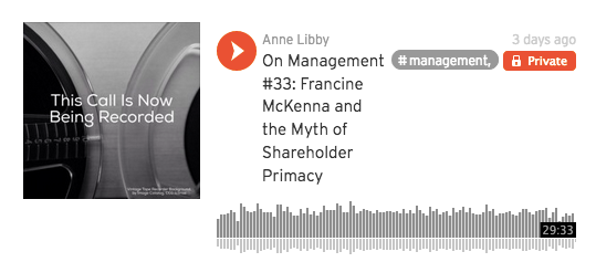 In this month’s audio, journalist Francine McKenna talks with me about shareholder primacy and some of its effects.